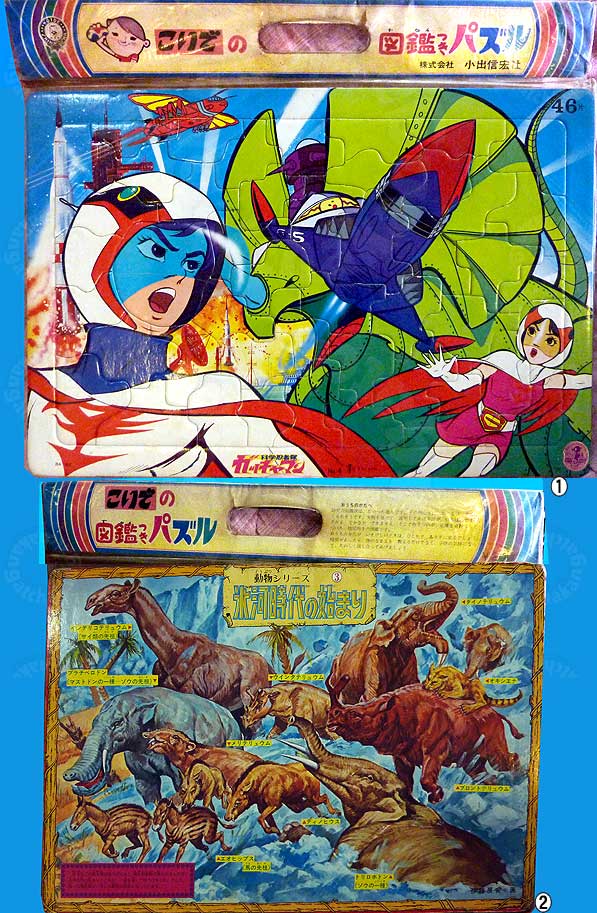 品名:こいでの図鑑つきパズル科学忍者隊ガッチャマンno.4・メカニカ 他にいくつかこいでのパズルが発売されているが、会社名が株式会社小出信宏社になっているのが珍しい。多分初版は、この名前だと思われる。 ①パズルの表、メカニカ回をモチーフにしている。イブクロンも後ろの方で飛行している。 ②パズルの裏。これが図鑑になっていて恐竜図鑑 ③パズルのタグに書いてある文面 「おうちのかたへ 幼児の知識欲は、たいへん盛んです。その熱心さに、おとなは、おしまくられそうです。実物を見せて 説明してあげるのが、いちばんですが、それも なかなか できません。そこに役立つのが、正確な資料にもとづいた 幼児むきの図鑑です。 と書いてあります。