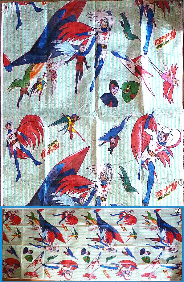 品名:科学忍者隊ガッチャマンレジャーシート 横88㎝、縦180㎝。ガッチャマンや忍者隊達の絵がちりばめられている。 ①レジャーシートアップこの絵柄が繰り返三、四回繰り替えされている。 絵柄が万創の製品に多い絵なので発売元はもしかしたら万創かもしれない。 ②レジャーシート全体 横88㎝、縦180㎝なのでかなり大きい